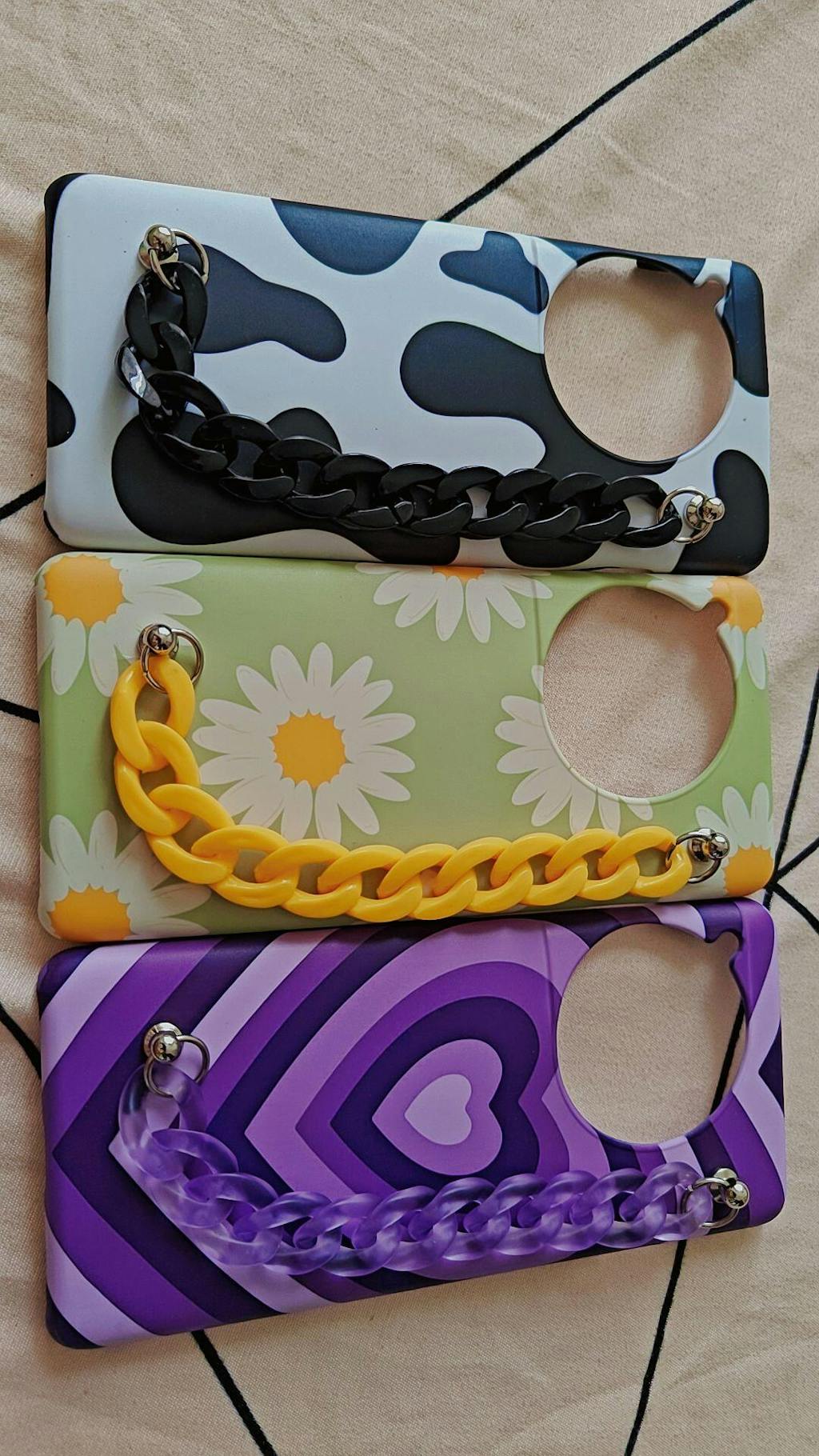 • Please note that the chains are intended solely for decorative purposes. They are not engineered to support weight or endure rough handling, and any such use may result in damage. The metal rivets used for chain attachments create a hard contact point; consequently, an accidental drop may result in damage to the mobile back. We recommend treating them with care to preserve their aesthetic quality and longevity.